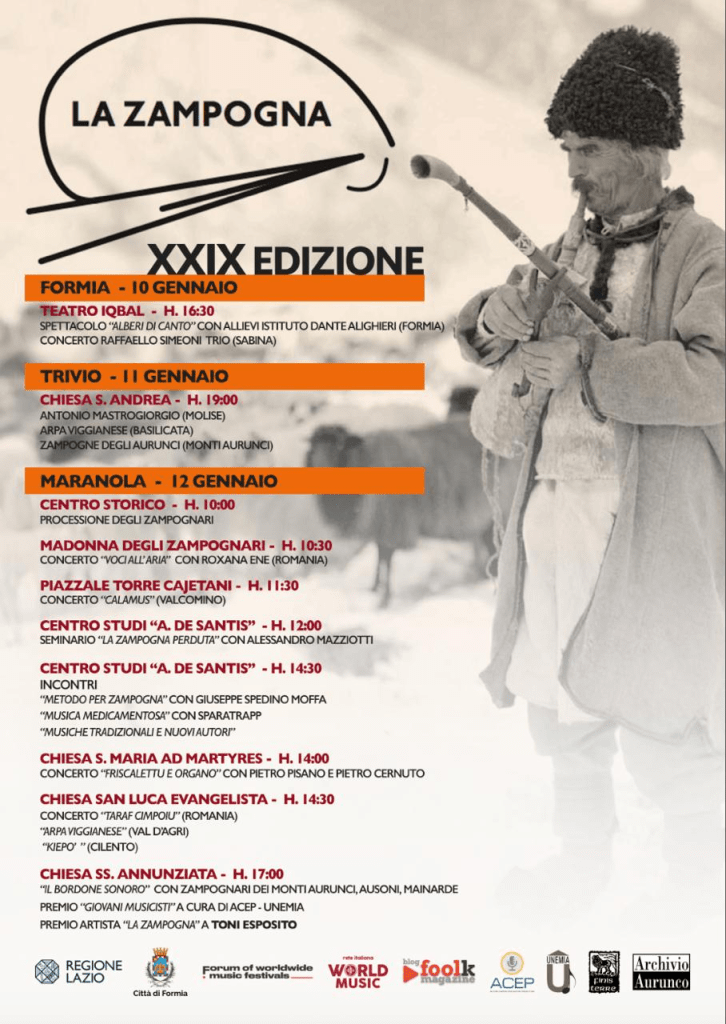 Ore 17:00 – Chiesa SS. Annunziata: Evento conclusivo “Il Bordone Sonoro” con Zampognari dei Monti Aurunci, Ausoni, Mainarde, premiazione “Giovani Musicisti” a cura di Acep-Unemia e Premio Artista “La Zampogna” a Tony Esposito.