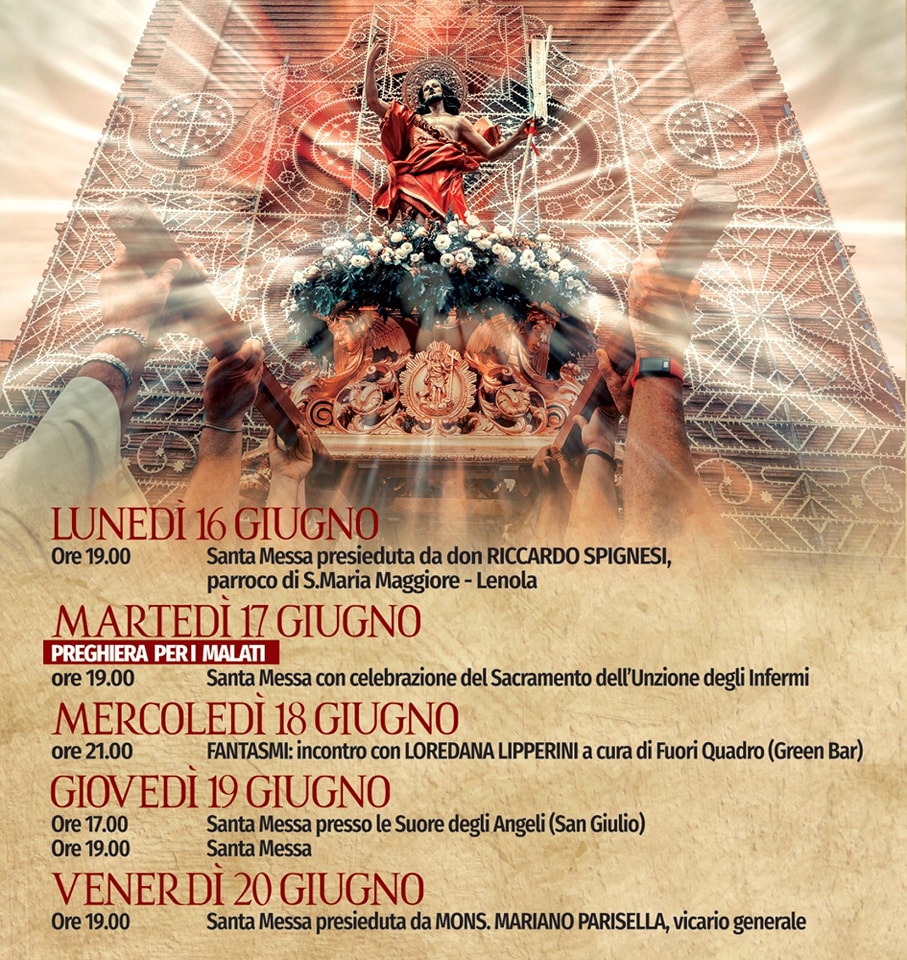 - Ore 19.00: Celebrazione eucaristica con benedizione del pane di Sant’Antonio, Intronizzazione della statua di San Giovanni Battista e Canto dell’Inno di San Giovanni.