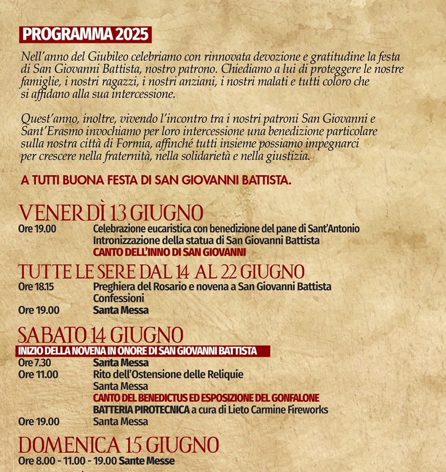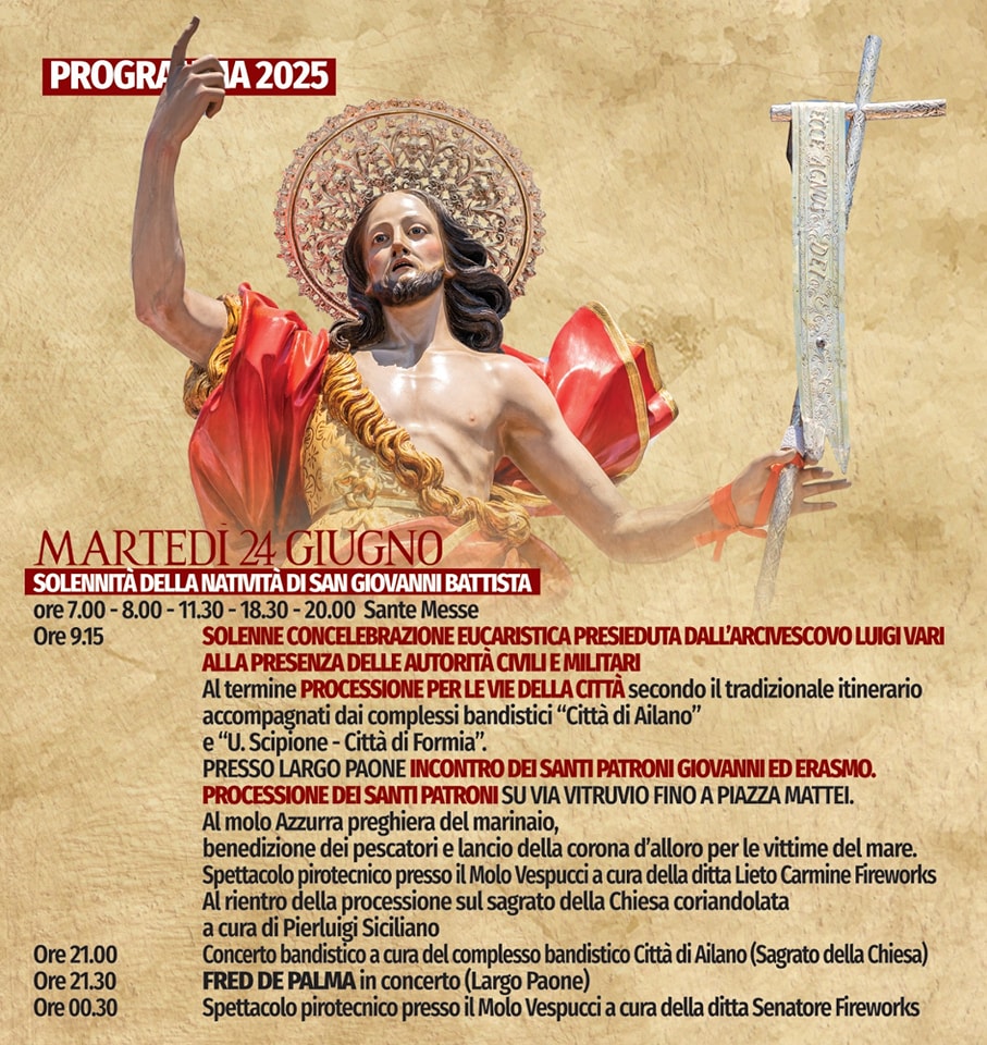 Anche quest’anno Formia si prepara a celebrare San Giovanni Battista Patrono della città e dei pescatori. Un ricco programma di appuntamenti religiosi e civili accompagnerà la comunità e i visitatori dal 14 al 24 giugno 2025, con momenti di raccoglimento spirituale, eventi culturali, spettacoli e tradizioni popolari.